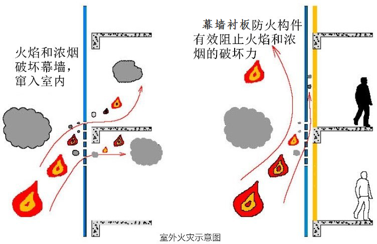 Gardinvæg brandsikre komponenter kan effektivt forhindre den destruktive kraft af tyk røg og flammer i brande. Som vist i figuren nedenfor er der ofte mellemrum mellem den lodrette gardinvæg og den vandrette gulvplade, hvis den efterlades ubehandlet eller forkert behandlet, kan tyk røg og flammer sprede sig opad gennem disse huller til næste etage.